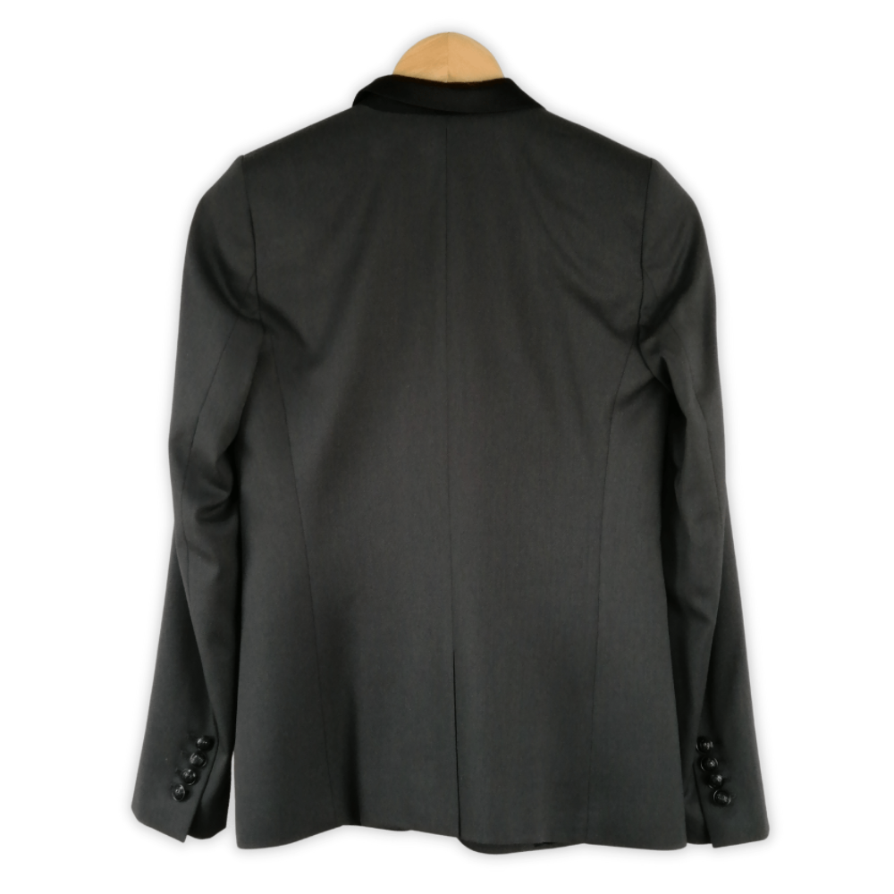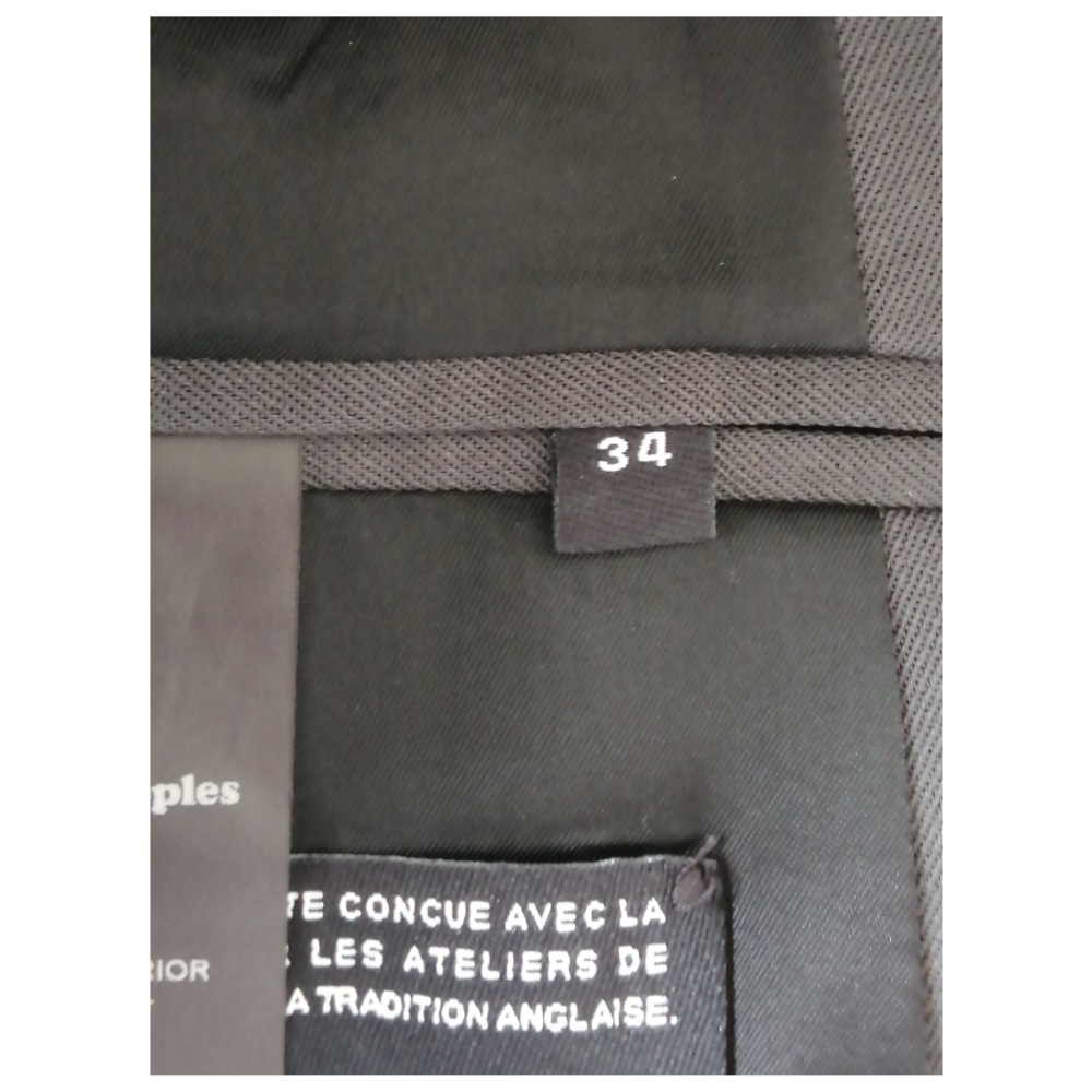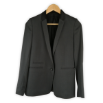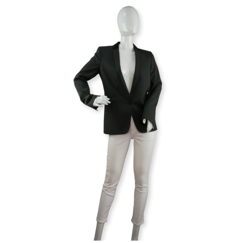 Description: The The Kooples blazer is a classic piece with a sophisticated cut, ideal for formal occasions or elevating a casual outfit. Made of 98% wool and 2% elastane, it offers both comfort and structure. The inner lining, composed of viscose and polyester, ensures a smooth touch. Features include a velvet-detailed collar, single front button closure, and two flap pockets. Size 34 FR. Never worn — perfect for refreshing your wardrobe with a premium quality staple.