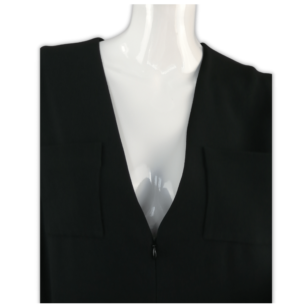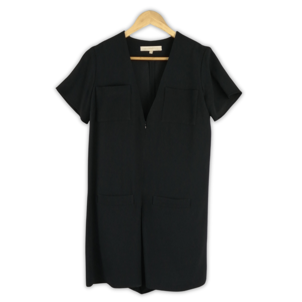Its minimalist design highlights functional details like the deep V-neck, discreet front zip, and four applied pockets – two on the chest and two lower front. This combination gives the jumpsuit a modern utilitarian edge while keeping a classic, timeless look. Short sleeves and a back slit enhance the clean silhouette.